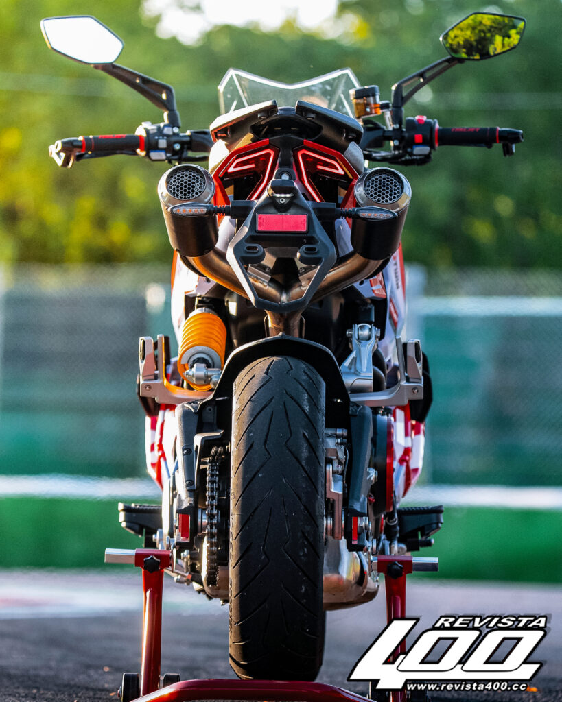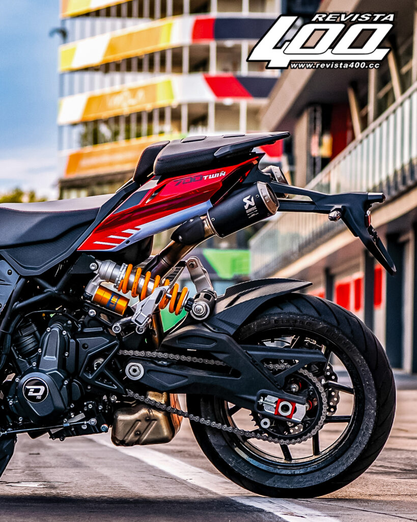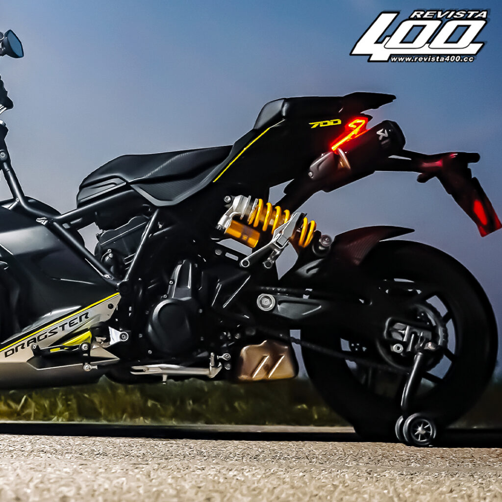 El Dragster 700 Limited Edition se caracteriza por su amortiguador Öhlins trasero y escape doble Akrapovic ofrecidos de serie.