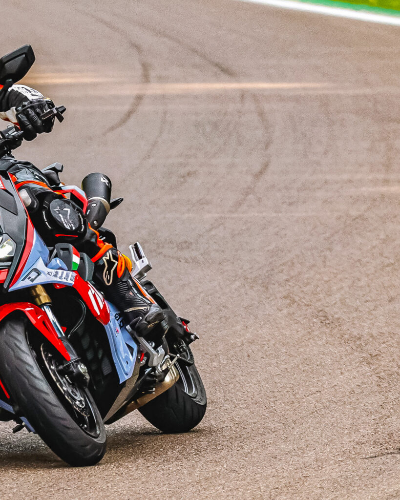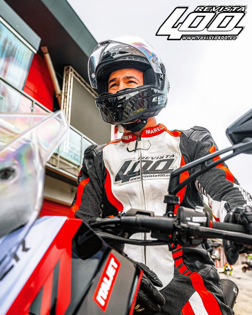 Finalmente, llegó el momento de ponernos el mono y salir a la pista para acabar con los nervios y la expectativa. El Dragster 700 Twin nos recibió amablemente en su puesto de conducción durante todo el periodo de adaptación, con mandos accesibles y un motor dulce en la parte baja, pero con una fuerte entrega a mayores revoluciones. Cabe destacar que este primer contacto lo llevamos a cabo sobre la Limited Edition, caracterizada por su amortiguador posterior Öhlins, sistema de videocámara integral, escape Akrapovic y la posibilidad de contar con la decoración Gresini, que refuerza la colaboración de Italjet con el equipo privado de Moto2.