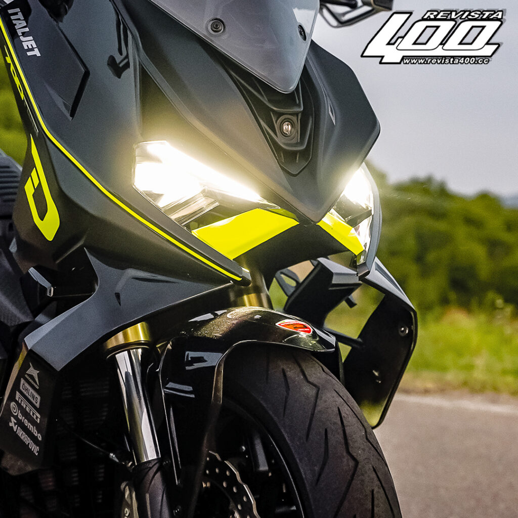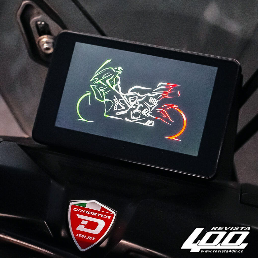 En cuanto a su estética, rompe con todos los esquemas ya que sus formas han evolucionado -incluso- con respecto a los prototipos presentados por Italjet en años anteriores, con líneas más agresivas fortalecidas por alerones perfectamente integrados y una parte baja completamente carenada. Todo ello sin olvidar ciertos aspectos de la funcionalidad, como un parabrisas que alcanza a desviar parte del aire y una posición de manejo más bien citadina y relajada, que nos llevará nuevamente a la deportividad absoluta por todos los detalles de diseño que encontramos alrededor del cockpit.