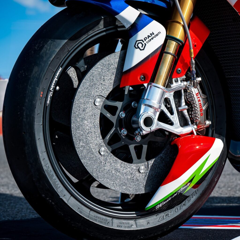 Por primera vez, una moto disponible al público llega equipada con frenos carbon-carbon, el mismo sistema que utilizan Bezzecchi y Martín en sus RS-GP26. El sistema Brembo emplea discos de 340 mm que pesan la mitad que un disco de acero convencional, garantizando una potencia de frenada nunca vista antes en una moto de venta al público.