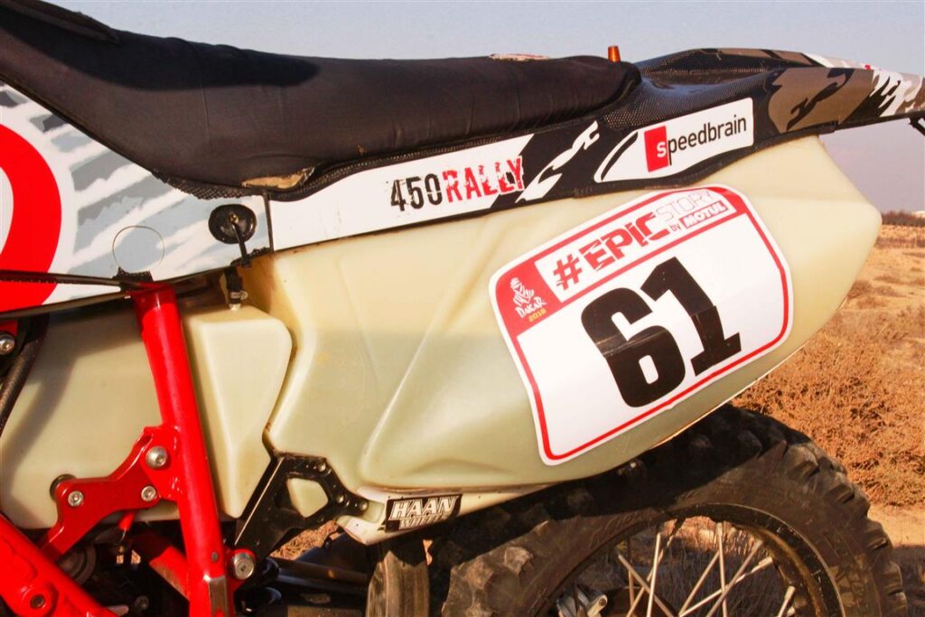 Otro elemento distintivo frente a una moto de producción es la capacidad de combustible. Las motos del Dakar incorporan múltiples depósitos distribuidos en la parte frontal y trasera, con capacidades que superan a cualquier modelo de serie (hasta 32L). Esta configuración ayuda a repartir el peso de forma equilibrada, con el objetivo de mantener la estabilidad al cruzar arena profunda a alta velocidad, además de brindar mayor autonomía a lo largo de las jornadas.