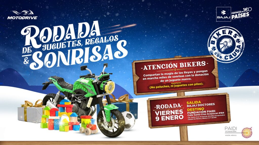 Bajaj ha convocado a la comunidad biker a participar en una rodada con causa. Un recorrido especial planeado para el próximo viernes 9 de enero, con salida desde la agencia Bajaj Doctores y destino en la Fundación PAIDI, ubicada en Calle Santa Cruz Acayucan #184, Colonia Santa Cruz Acayucan, en la Ciudad de México. Una invitación a rodar con propósito, donde cada kilómetro suma para llevar juguetes y sonrisas a niñas y niños que esperan estas fechas con ilusión.