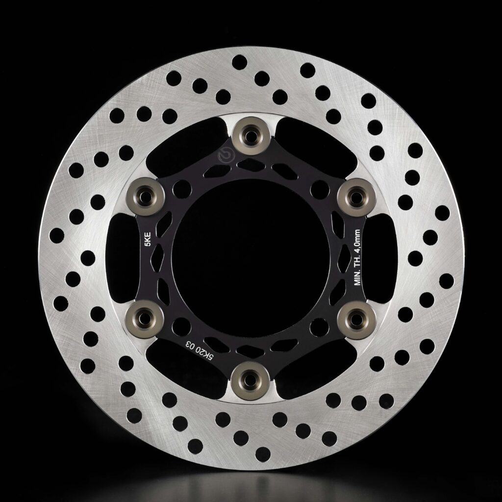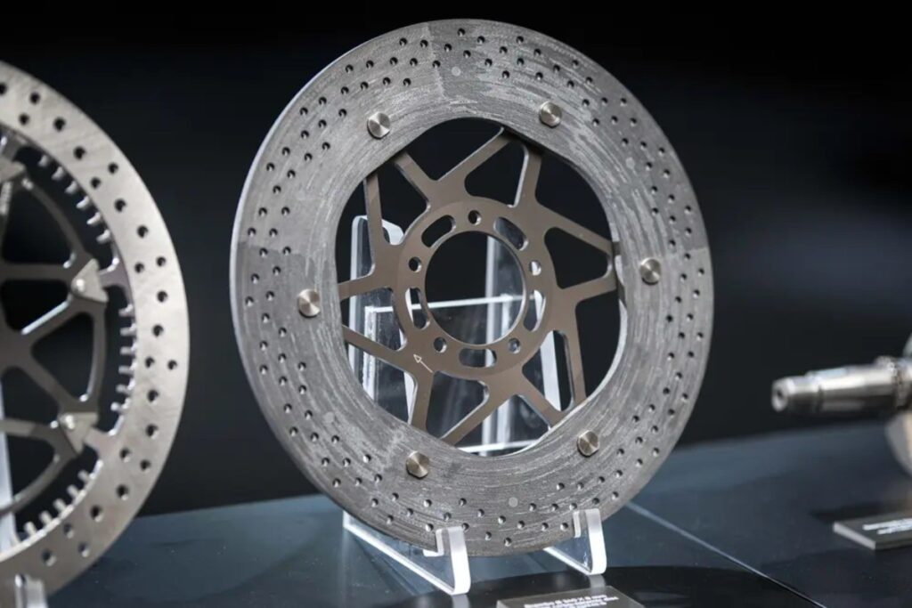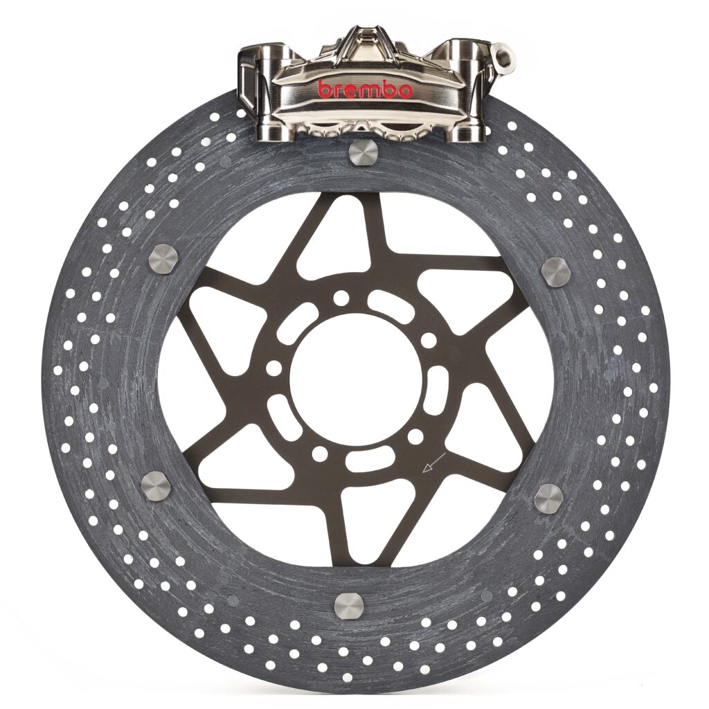 El componente central es el disco cerámico de carbono Hyction, nombre que combina “hiper” y “acción”, un material desarrollado originalmente para hipercoches y adaptado por primera vez para aplicaciones en motos de calle. Está fabricado con un compuesto de matriz de carbono reforzada con fibras e integrado con silicio y carburo de silicio, derivado de la tecnología CCM-R que Brembo ya utiliza en autos de rendimiento extremo. El resultado es una resistencia térmica y estabilidad estructural que permiten mantener la respuesta de frenado constante y predecible incluso bajo esfuerzos prolongados.