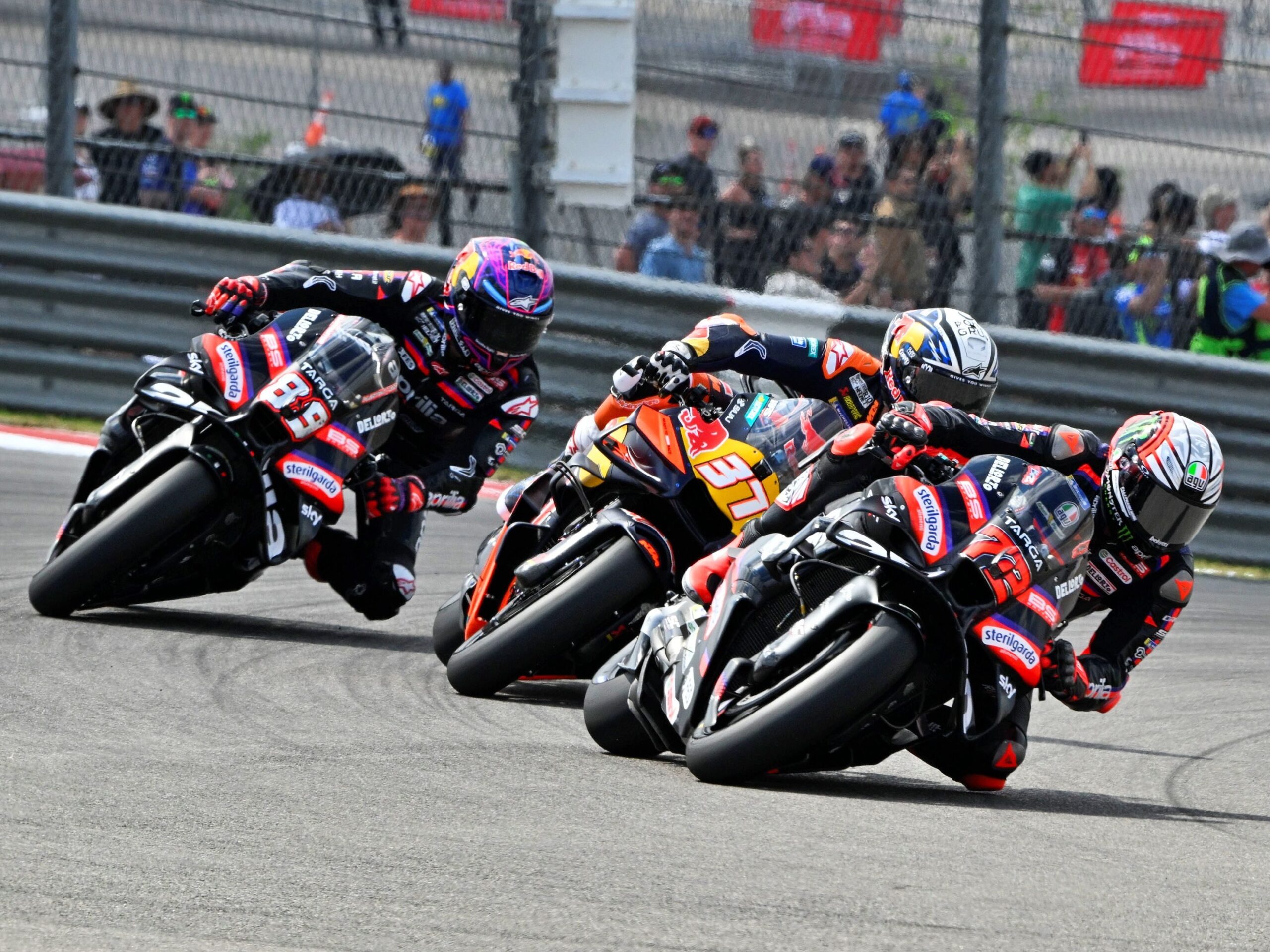 El sábado arrancó con una clasificación tensa. La búsqueda de rebufos generó tráfico y derivó en sanciones que alteraron la parrilla de salida. Aunque Fabio Di Giannantonio consiguió la pole, el orden real en pista ya anticipaba una carrera caótica. Desde la primera curva de Austin, una sección muy crítica por su inclinación y espacio reducido, varios pilotos se vieron obligados a abrir trayectoria, provocando cambios inmediatos en posiciones.