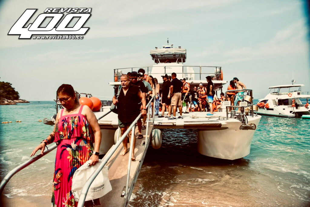 Para el siguiente día, se planificó un completo programa de actividades que contempló un paseo en catamarán, snorkel y comida en una playa privada, entre otras cosas. Durante el recorrido por la bahía descubrimos las vistas más escondidas y espectaculares de la costa jalisciense, hasta llegar a la playa privada de Majahuitas de acceso únicamente marítimo, para seguir disfrutando ahora de una comida buffet que degustaríamos en cómodos sillones bajo la sombra de las palmeras.