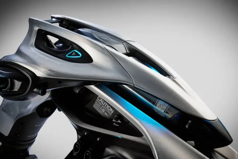 Su estructura también rompe con lo convencional, haciendo uso de un monocasco central con componentes móviles que le permiten modificar su centro de gravedad y mantener el equilibrio sin ayuda externa. Incluso prescinde del manillar y los frenos tradicionales, sustituyéndolos por servomotores que responden a gestos, expresiones o comandos del piloto, una fusión inédita entre control humano y asistencia autónoma.