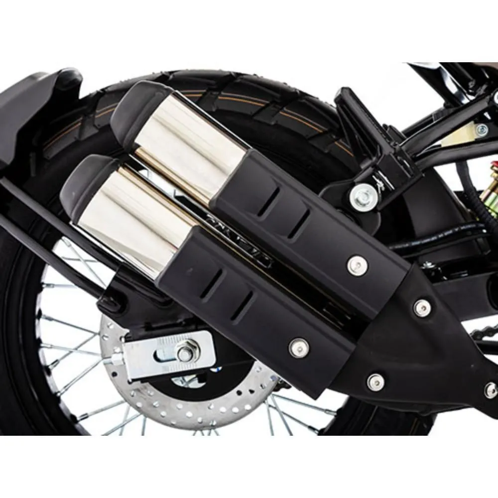 En la parte ciclo, incorpora una horquilla invertida delantera que se traduce en una dirección más precisa y estable al frenar fuerte o inclinar en curvas, además de aportar un aspecto más moderno y agresivo a la motocicleta. El paquete completo de suspensiones lo completan un monoshock trasero ajustable que ofrece una gran absorción del terreno y confort. También suma frenos de disco delantero y trasero, buscando una respuesta precisa en distintas condiciones de manejo. Elementos como el escape de doble salida, la quilla y los rines de rayos de 17 pulgadas terminan de reforzar su identidad clásica.