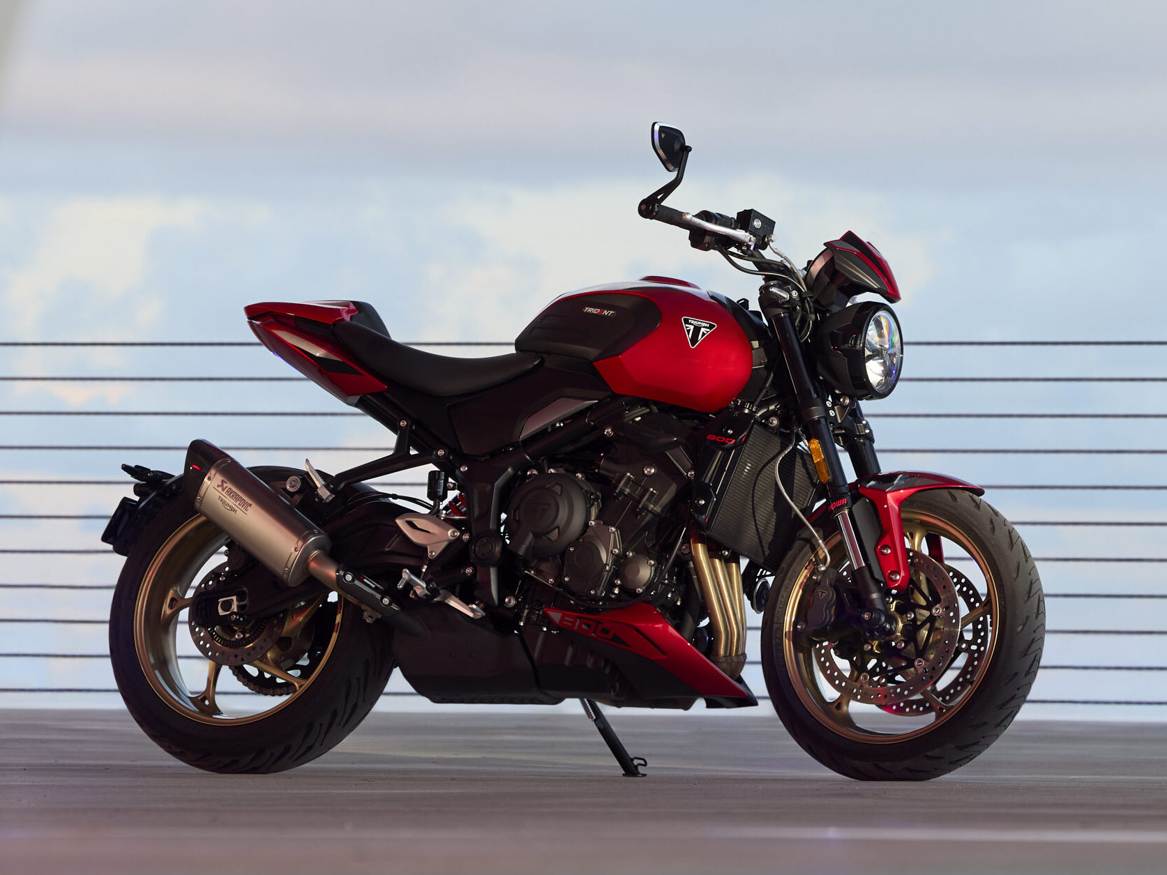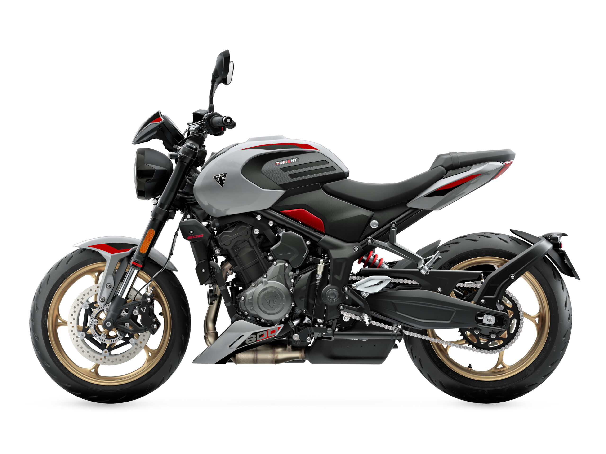 Visualmente, la Trident 800 comparte en su mayoría el diseño de su hermana menor, pero con detalles extra como una pequeña cúpula sobre el faro, un escape Akrapovic de estilo más deportivo y nuevos rines de aluminio en color dorado que contrasta perfecto con su gama de colores disponibles: Ash Grey con detalles en Diablo Red, Carnival Red con toques en Graphite, y Jet Black.