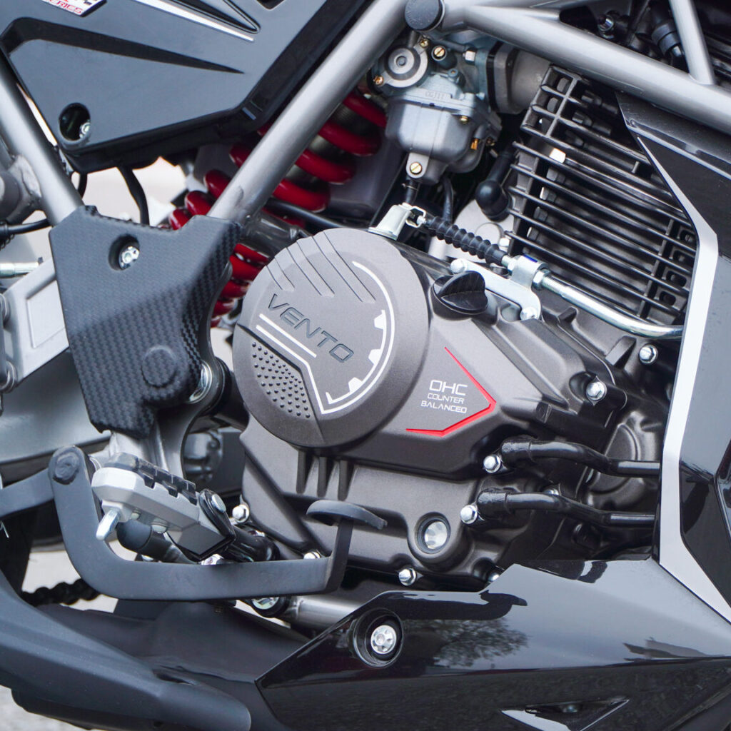En cuestión de equipamiento, la Nitrox 330 conserva varios elementos que ya encontramos en la versión anterior, como horquilla hidráulica invertida al frente y monoshock en la parte trasera, la iluminación se mantiene completamente led y cuenta con el mismo tablero digital que ofrece información completa de la motocicleta. El sistema Ventec y la alarma con encendido a distancia son elementos que encontramos en la Nitrox y toda la gama de modelos de Vento, y para frenar, el modelo sigue confiando en discos ventilados en ambas ruedas, y sus rines de 17 pulgadas, ahora de color negro con una parte en cromo, montan llantas en medidas 110 adelante y 140 atrás.