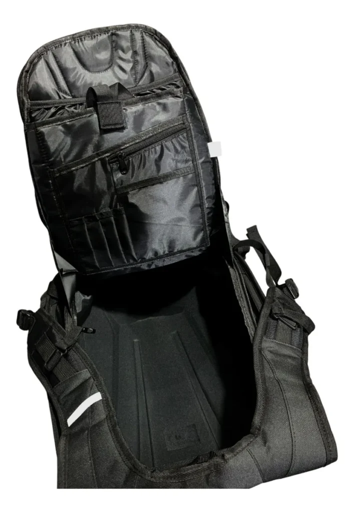 Con dimensiones de 38×50 cm y una capacidad de hasta 48 litros, ofrece un espacio amplio para guardar desde equipo de seguridad hasta objetos personales. Su peso ligero de solo 1.15 kg la hace cómoda de llevar sin comprometer el equilibrio sobre la moto, mientras que sus correas ajustables en pecho y cintura, junto a los tirantes acolchados, proporcionan un ajuste ergonómico que distribuye el peso de forma uniforme.