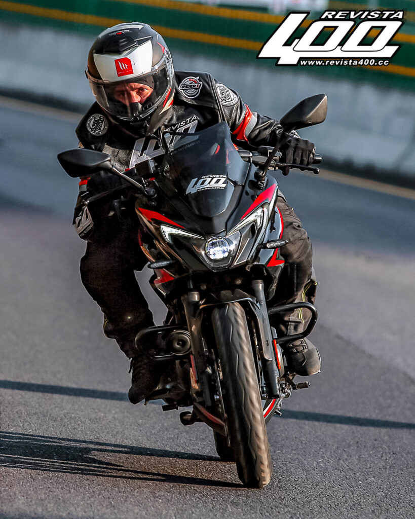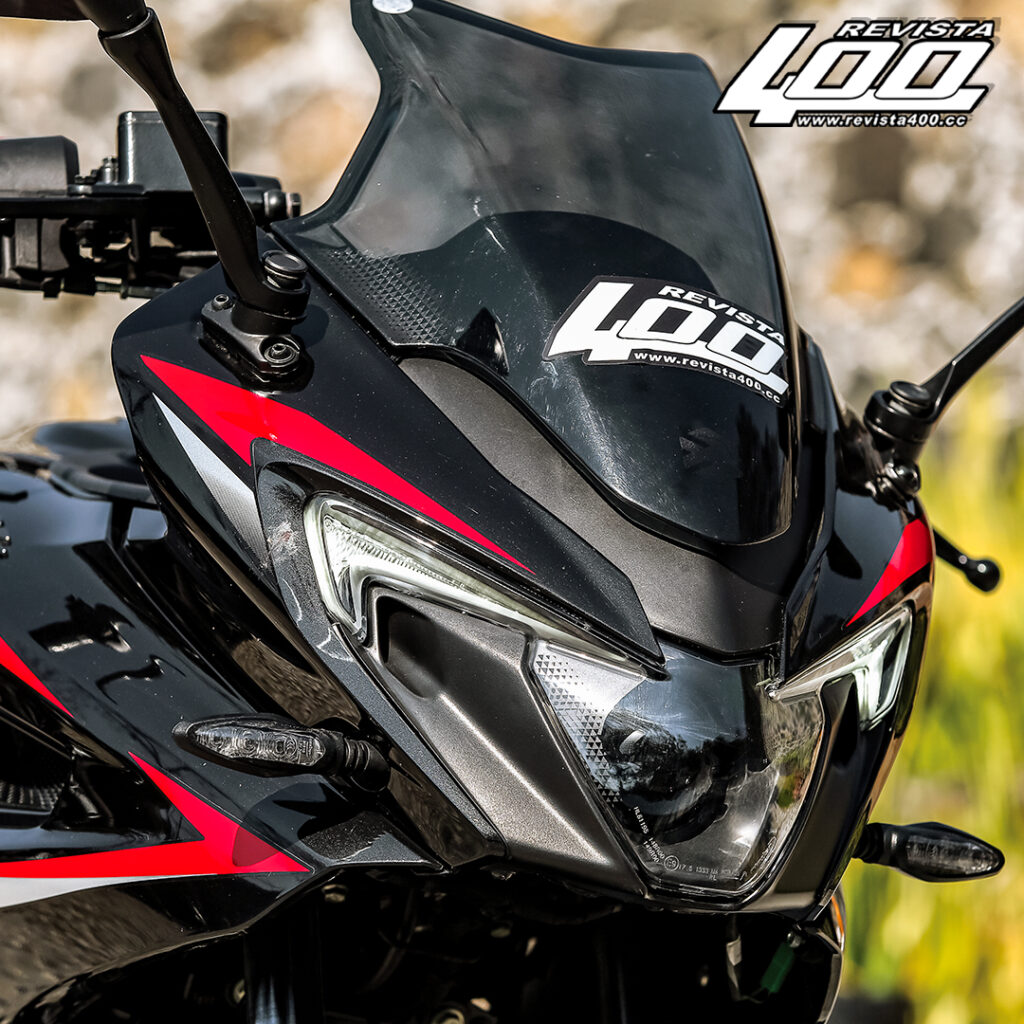 No solo eso, su fairing frontal envolvente hace percibirla visualmente como una motocicleta más madura, mientras que los espejos anclados al carenado refuerzan su identidad sport, aunque representen un obstáculo cuando se quiere filtrar con rapidez pese a ser ajustables en posición. Su faro frontal se compone de una lupa principal complementada por líneas que sirven como luz diurna, brindando iluminación suficiente con tecnología led en todo el conjunto.