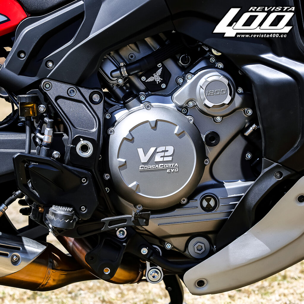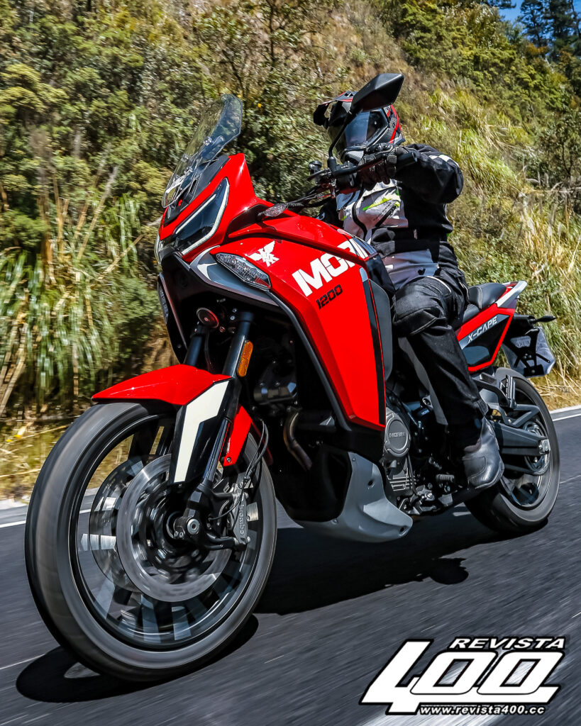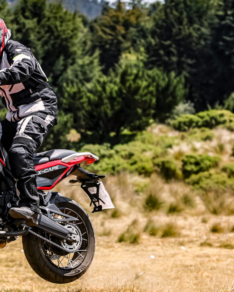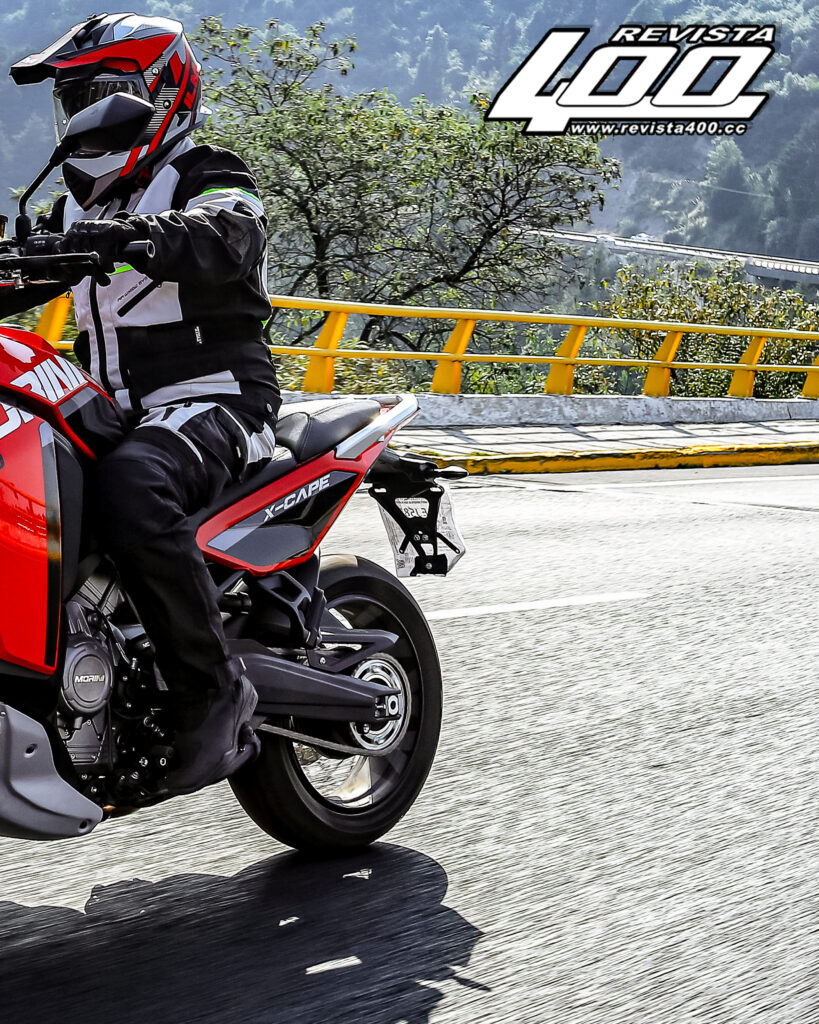 En cuanto a su motor, el alma que le da nombre a esta versión de la X-Cape es un V2 a 87 grados de 129 hp, que es capaz de sacar una sonrisa instantánea con su sonido ronco y de gran presencia. Sin dudas, es una mecánica que suena distinto y tiene gran personalidad. Pero lo que más sorprende es algo que no esperábamos de él: la ausencia de calor. Durante los días que duró la prueba de manejo, las altas temperaturas en Ciudad de México fueron una constante, esos días en que el asfalto hierve y el tráfico para salir de la ciudad lo complica todo. En muchas motos de esta cilindrada o incluso algo menores, cuando te detienes en un semáforo, sientes el calor en el interior de las piernas. Aquí no pasó y es de destacar por su sistema de enfriamiento, el cual está tan bien logrado que en ningún momento se siente ese calor incómodo.