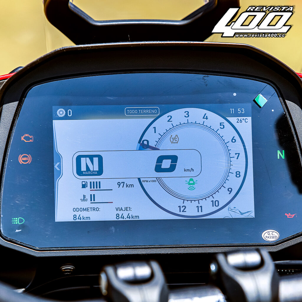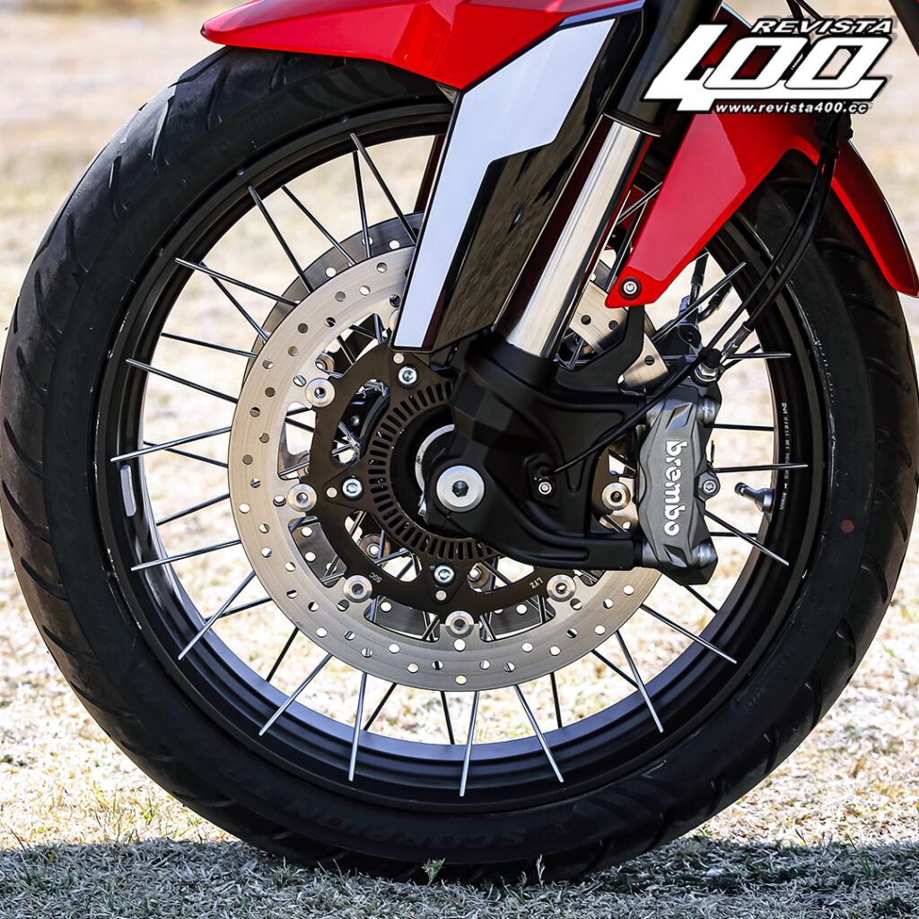 Finalmente, en cuanto a frenos, cuenta con dos enormes discos delanteros de 320 mm con pinzas radiales Brembo, que son una auténtica maravilla. En detenciones de emergencia sobre tierra, el ABS hizo su trabajo sin ser excesivamente invasivo, sino lo mínimo indispensable para mantener la trayectoria. El control de tracción, incluso en modo off, deja que la llanta trasera patine lo suficiente, pero sin llegar a aventarte al suelo.
