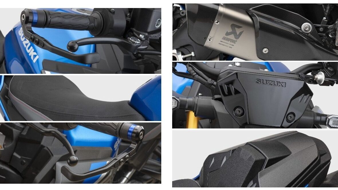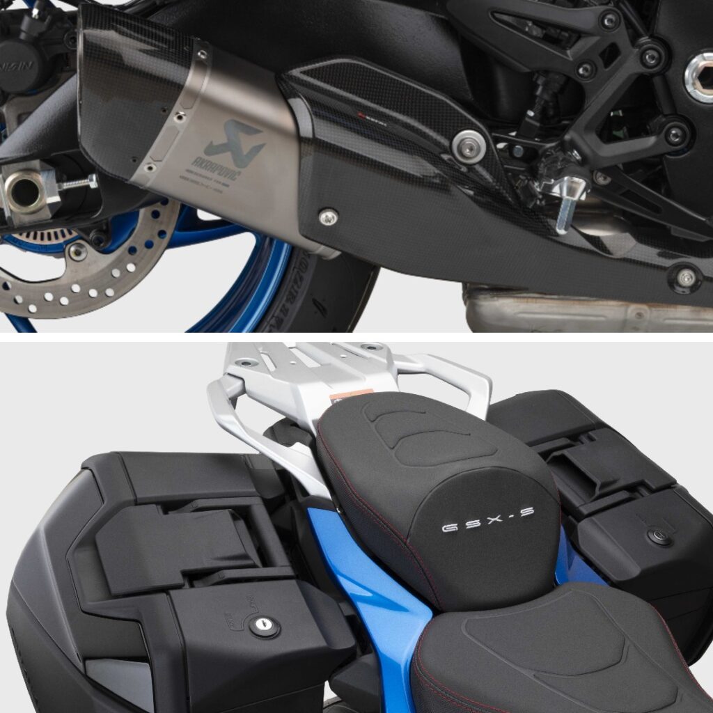 En el caso de la GSX-S1000GT también encontramos un escape Akrapovic, se suman puños calefactados, un sistema completo de maletas laterales, manetas específicas, contrapesos, asiento bordado y protectores de tanque. El resultado es una grand tourer que combina prestaciones deportivas y funcionalidad para la ruta.